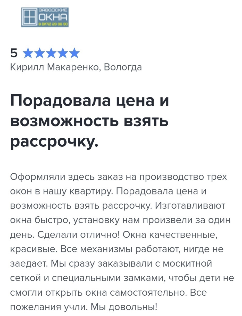 Компания "Заводские окна" основана 2011 году. Мы производим современные заводские ПВХ-изделия и профессиональный монтаж с сочетанием цены и качества в Вологде!